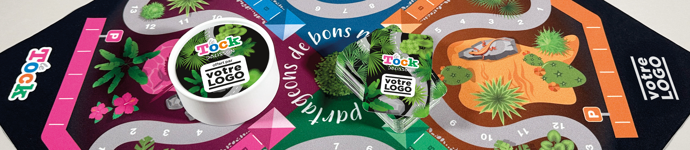 Au-delà de l’intégration de votre logo, nous proposons des options avancées en cohérence avec vos chartes graphiques : décor de fond sur-mesure, personnalisation complète du dos des cartes, adaptations graphiques du plateau ou autres demandes spécifiques.